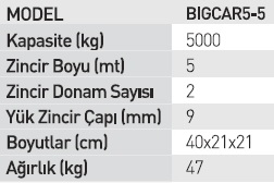 Kaldirma yüksekligi 5 Metredir. Tasima kapasitesi 5000 kg'dir. ( 5 Ton )